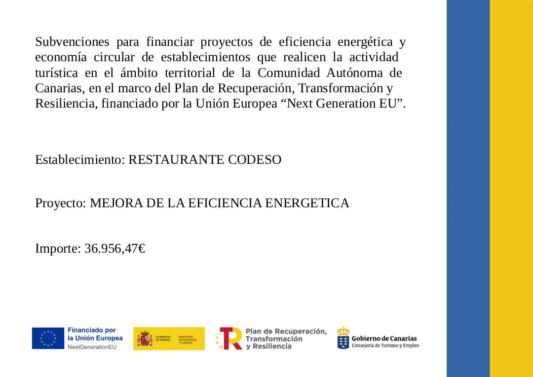 The restaurant offers a warm and inviting atmosphere, with a sophisticated interior design that blends contemporary elegance with traditional Canarian touches. The carefully curated décor, featuring local art and natural materials, creates an intimate and comfortable setting. Whether you’re here for an intimate dinner, a special occasion, or a gathering with friends, Codeso provides the perfect backdrop for an unforgettable dining experience.